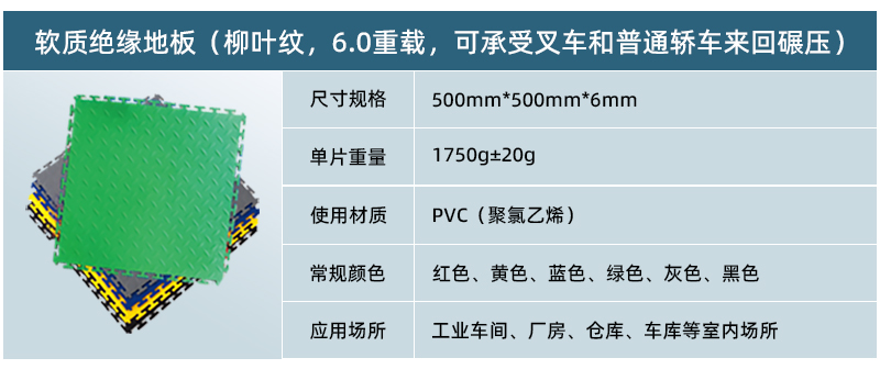 5、高承載,更防滑: 軟質(zhì)絕緣地板為實(shí)心結(jié)構(gòu),只要地面承重沒有問題,其承載能力能夠達(dá)到每平米10噸以上。地板表面在生產(chǎn)過程中帶有